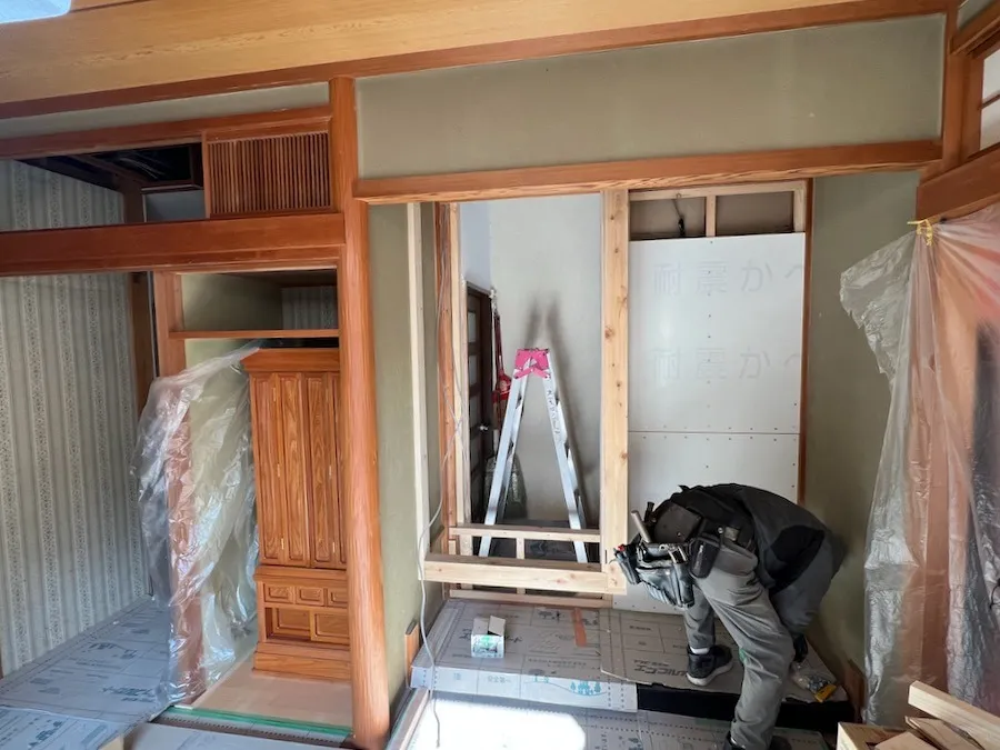 こちらのK様邸の工事はLDK側に置いている水屋(食器棚)の配置に適した場所が無く困って、壁をくり抜いて和室側の押入れの半分と床の間の半分をLDK側に取り込んで、そこに水屋を納めて障害物的に出っ張った状態を解消します。