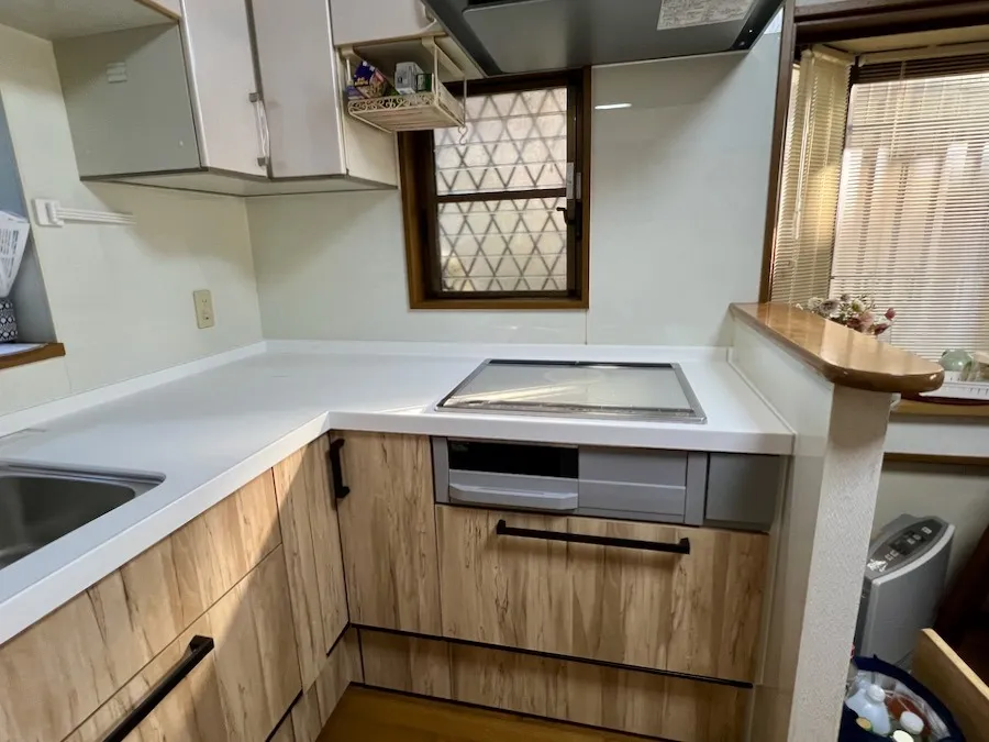 吊り戸棚はまだまだ使える状態なので下台とレンジフードを入れ替えさせていただきました。