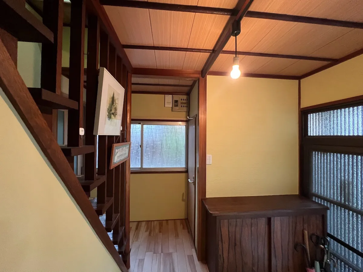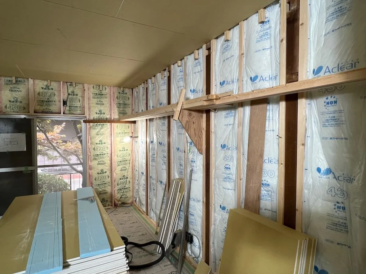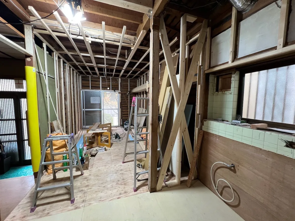 昭和時代の家、令和にリノベーションを行う 2025/10/21 昭和時代の家を令和にリニューアル 門真市 H様邸 昭和40年代に建てられた木造2階建て木造住宅です。1階部分の全面リニューアルと、2階の1部屋の内装リニューアル工事を行いました。 断熱材が入っていなかった床・壁・天井を解体して断熱材を施工しました。床を解体してみると、土間は建築時に地盤改良されているようで、布基礎ですがガチガチに固い地盤の上に建てられているのでかなりしっかりとした状態でした。断熱施工してリニューアルすればまだまだ安心して長く住み続けることができます。耐震補強も有効な範囲で行いました。 DATE 建物:木造2階建 施工費: 530万円 面積:13坪 築年数:52年 施工期間:1,5ヶ月 家族構成:夫婦 1 - 1 (After) 玄関 玄関廻り。和風の趣は残しつつ全面リフォームしました。 1 - 2 (After) 玄関 壁は真壁のまま珪藻土を塗りました。柱も天井の竿縁も木部は良い具合に飴色にやけて経年のシブさと趣を感じます。 1 - 3 (After) 玄関 天井は、竿縁は残してイナゴ天井の貼り替えです。 2 - 1 (After) キッチン 間口1950のシステムキッチンを入れ替えました。 キッチン前の壁にはモザイクタイルを貼りました。 2 - 2 (After) キッチン システムキッチンの後部にはカウンターテーブルを現場造作しました。 タモの集成材に半艶のCL仕上げです。 2 - 3 (After) キッチン 食器収納の水屋はカウンター下に設置しました。 3 - 1 (After) リビング リビングとキッチンのエリアを仕切る場所に仕切りの無い、物をやり取りできるカウンター棚を設置しました。 3 - 2 (After) リビング 使い勝手の良い可動棚として設置しました。 3 - 3 (After) リビング 約8帖のリビングスペース。薄いグレーのクロスは光の反射が柔らかいので落ち着きます。 4 - 1 (After) 1階和室 和室とキッチンの取り合いの建具は引き違いの格子戸を設置しました。クリヤーガラスで採光もあり奥行きを感じます。 4 - 2 (After) 1階和室 畳は普通のイグサ畳を新調です。 4 - 3 (After) 1階和室 掃き出しサッシはガス入り高性能ガラスの内窓を設置しました。断熱性能はSクラスです。 5 - 1 (After) 2階和室 2階の和室は内装のリニューアルを行いました。 5 - 2 (After) 2階和室 畳新調、襖張り替え、壁は珪藻土に塗り替えです。 6 - 1 (Before) 1階和室A 畳、壁は聚楽塗り、竿縁天井のオーソドックスな和室でした。 6 - 2 (Before) 1階和室A 6 - 3 (Before) 1階和室B 1階の別の和室も同じ仕様でした。 7 - 1 (Before) キッチン システムキッチンは一度リフォームされていました。 7 - 2 (Before) DK 6帖のDKと和室は間仕切り壁で隔てられていました。 7 - 3 (Before) 玄関 内装は経年劣化で少々くたびれた感じでした。 8 - 1 (工事過程) 和室B 解体が終了。 8 - 2 (工事過程) 和室A 耐震補強も可能な範囲で行いました。 8 - 3 (工事過程) 和室A 全面に断熱材を施工しました。 戸建て住宅リフォーム