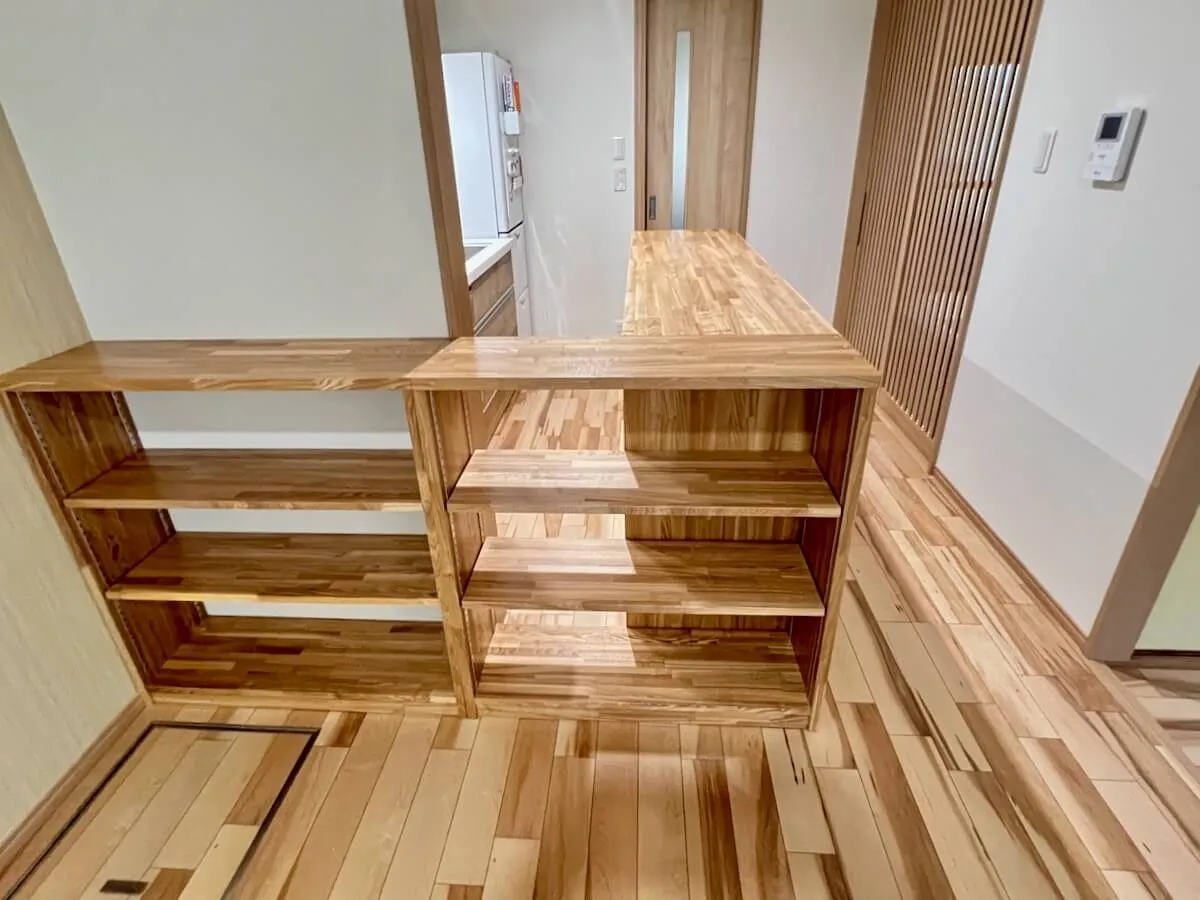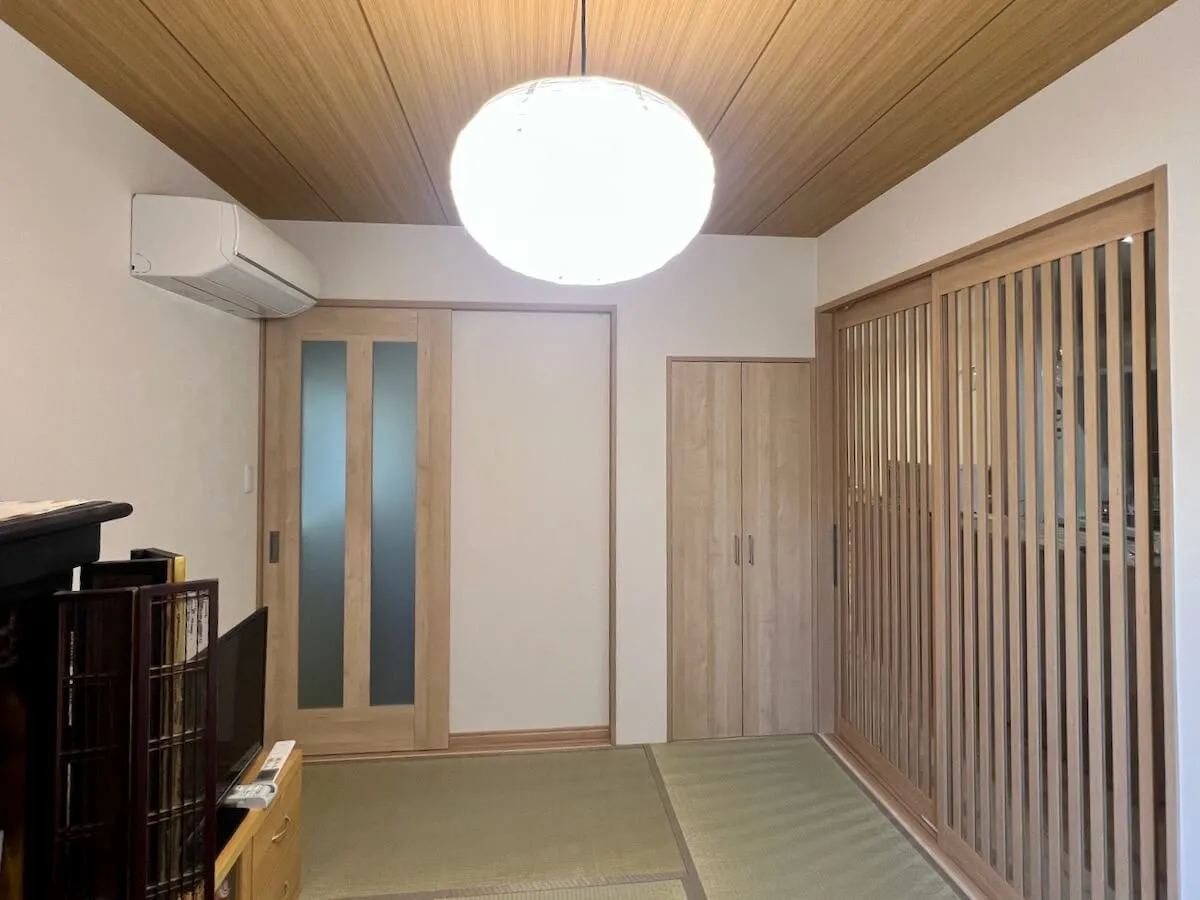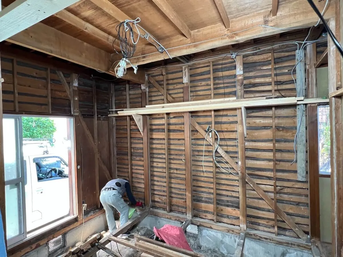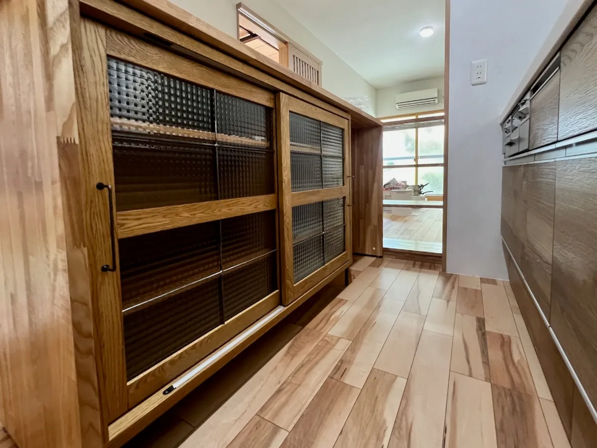 昭和時代の家、令和にリノベーションを行う 2025/10/21 昭和時代の家を令和にリニューアル 門真市 H様邸 昭和40年代に建てられた木造2階建て木造住宅です。1階部分の全面リニューアルと、2階の1部屋の内装リニューアル工事を行いました。 断熱材が入っていなかった床・壁・天井を解体して断熱材を施工しました。床を解体してみると、土間は建築時に地盤改良されているようで、布基礎ですがガチガチに固い地盤の上に建てられているのでかなりしっかりとした状態でした。断熱施工してリニューアルすればまだまだ安心して長く住み続けることができます。耐震補強も有効な範囲で行いました。 DATE 建物:木造2階建 施工費: 530万円 面積:13坪 築年数:52年 施工期間:1,5ヶ月 家族構成:夫婦 1 - 1 (After) 玄関 玄関廻り。和風の趣は残しつつ全面リフォームしました。 1 - 2 (After) 玄関 壁は真壁のまま珪藻土を塗りました。柱も天井の竿縁も木部は良い具合に飴色にやけて経年のシブさと趣を感じます。 1 - 3 (After) 玄関 天井は、竿縁は残してイナゴ天井の貼り替えです。 2 - 1 (After) キッチン 間口1950のシステムキッチンを入れ替えました。 キッチン前の壁にはモザイクタイルを貼りました。 2 - 2 (After) キッチン システムキッチンの後部にはカウンターテーブルを現場造作しました。 タモの集成材に半艶のCL仕上げです。 2 - 3 (After) キッチン 食器収納の水屋はカウンター下に設置しました。 3 - 1 (After) リビング リビングとキッチンのエリアを仕切る場所に仕切りの無い、物をやり取りできるカウンター棚を設置しました。 3 - 2 (After) リビング 使い勝手の良い可動棚として設置しました。 3 - 3 (After) リビング 約8帖のリビングスペース。薄いグレーのクロスは光の反射が柔らかいので落ち着きます。 4 - 1 (After) 1階和室 和室とキッチンの取り合いの建具は引き違いの格子戸を設置しました。クリヤーガラスで採光もあり奥行きを感じます。 4 - 2 (After) 1階和室 畳は普通のイグサ畳を新調です。 4 - 3 (After) 1階和室 掃き出しサッシはガス入り高性能ガラスの内窓を設置しました。断熱性能はSクラスです。 5 - 1 (After) 2階和室 2階の和室は内装のリニューアルを行いました。 5 - 2 (After) 2階和室 畳新調、襖張り替え、壁は珪藻土に塗り替えです。 6 - 1 (Before) 1階和室A 畳、壁は聚楽塗り、竿縁天井のオーソドックスな和室でした。 6 - 2 (Before) 1階和室A 6 - 3 (Before) 1階和室B 1階の別の和室も同じ仕様でした。 7 - 1 (Before) キッチン システムキッチンは一度リフォームされていました。 7 - 2 (Before) DK 6帖のDKと和室は間仕切り壁で隔てられていました。 7 - 3 (Before) 玄関 内装は経年劣化で少々くたびれた感じでした。 8 - 1 (工事過程) 和室B 解体が終了。 8 - 2 (工事過程) 和室A 耐震補強も可能な範囲で行いました。 8 - 3 (工事過程) 和室A 全面に断熱材を施工しました。 戸建て住宅リフォーム